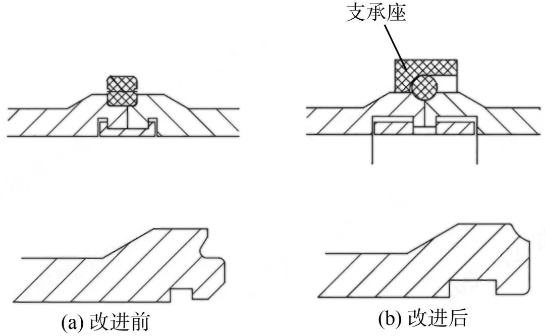 2.2 Improvement of the intermediate seal structure The original square intermediate seal was mainly designed with reference to the Schaeffler bearing. During installation, the seal is squeezed axially but not radially. Lubricating oil can easily enter the bearing through the gap between the half-shaft and the bridge housing and between the two inner rings, resulting in grease dilution and failure. In addition, due to the lack of radial extrusion, slippage is likely to occur during installation and under bending loads, leading to flipping. The intermediate seal was improved to an O-ring + support seat structure, and the mating part with the small end of the inner ring was processed into a crescent groove shape, as shown in Figure 4. Through design, the O-ring is subjected to pressure generated by interference fit in both the axial and radial directions during installation, thereby better fitting with the crescent groove. The average radial compression rate of the intermediate O-ring is 23.6%, which meets the requirements of GB/T 3452.3-2005 "Groove dimensions of O-ring rubber seals for hydraulic and pneumatic applications" and has a good sealing effect.